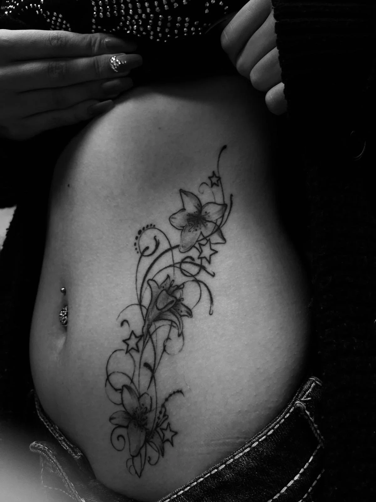 Ich arbeite bevorzugt in Woodcut Stil, Blackwork und floralen Motiven.